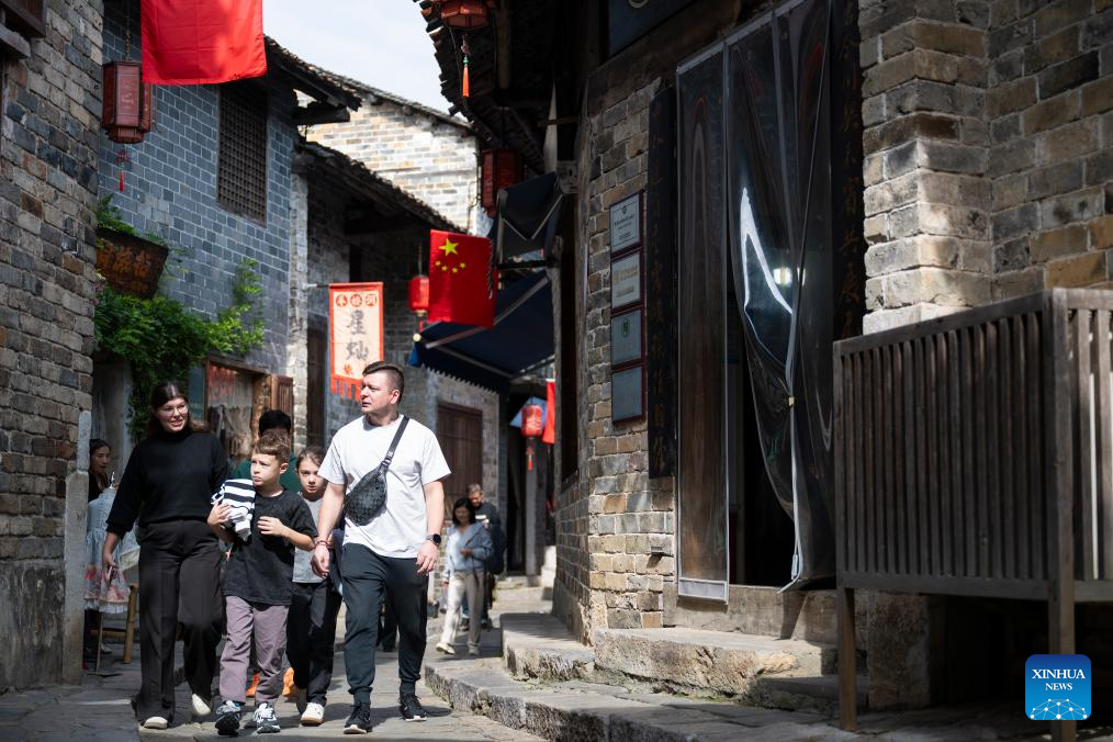 Foreign tourists visit the ancient street in Yangloudong of Chibi City, central China's Hubei Province, Oct. 29, 2025. Yangloudong has long been renowned as the hometown of brick tea and is one of the starting points of an ancient tea road. In recent years, the area has built a new tourism model to attract tourists by creating intangible cultural heritage themed blocks and introducing diversified business formats such as Hanfu-renting and photograph. (Xinhua/Wu Zhizun)