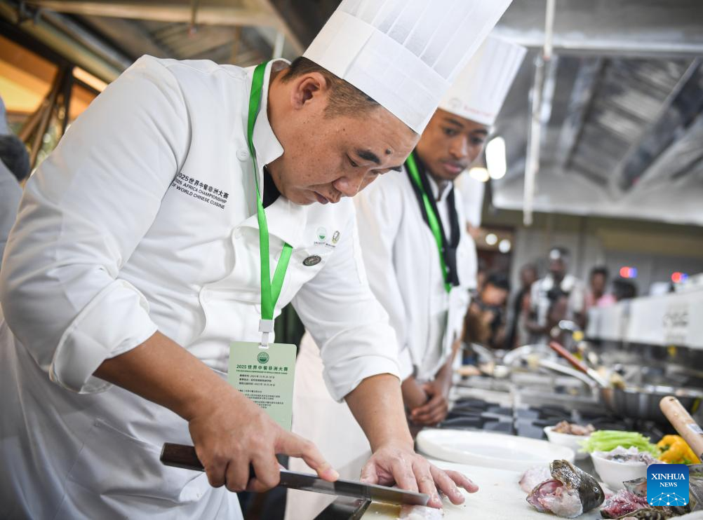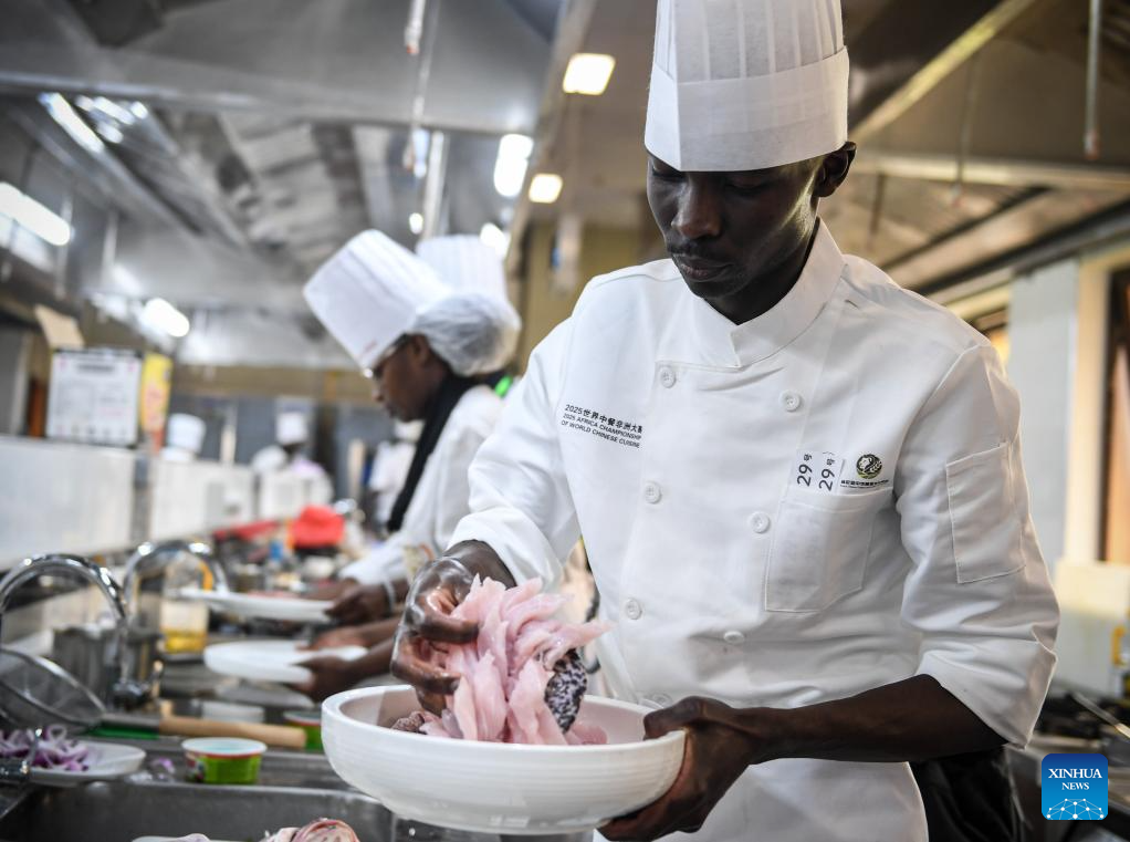 A contestant prepares a dish during the 2025 Africa Championship of Chinese Cuisine held in Nairobi, Kenya, Oct. 30, 2025. The 2025 Africa Championship of Chinese Cuisine, the first of its kind on the continent, was held Thursday in the Kenyan capital Nairobi, highlighting the deepening cultural exchanges between China and Kenya. (Xinhua/Li Yahui)