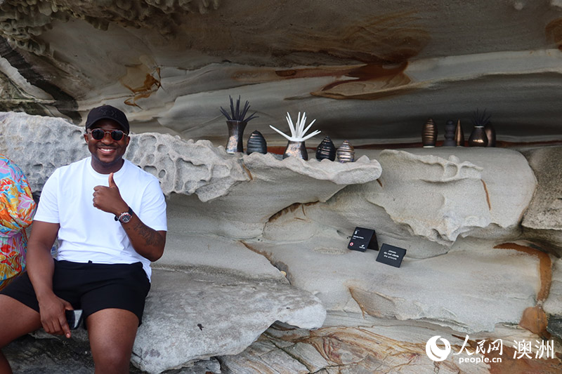 A visitor enjoys the 27th Sculpture by the Sea along Sydney's Bondi to Tamarama coastal walkway. (Photo/Liu Zitong)