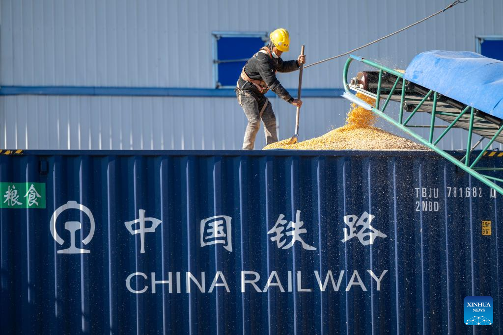 A loaded freight train is ready to depart a logistics park of China's leading food trader China Oil and FoodStuffs Corporation in Shuangyashan City, northeast China's Heilongjiang Province, Oct. 31, 2025. As Heilongjiang, one of China's major grain-producing province, has recently entered a busy period of grain transportation, China Railway Harbin Group Co., Ltd. has built an efficient and collaborative multimodal transport system, and established a connection mechanism with grain production enterprises in advance, to promote cost reduction, quality improvement and efficiency enhancement of the grain transportation. (Xinhua/Zhang Tao)