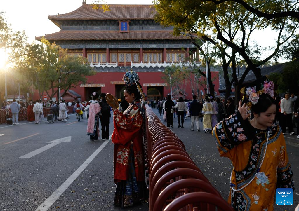 Tourists wearing traditional Chinese costumes walk by Donghua Gate, as known as East Prosperity Gate of the Palace Museum in Beijing, capital of China, Nov. 1, 2025. (Xinhua/Wang Lili)