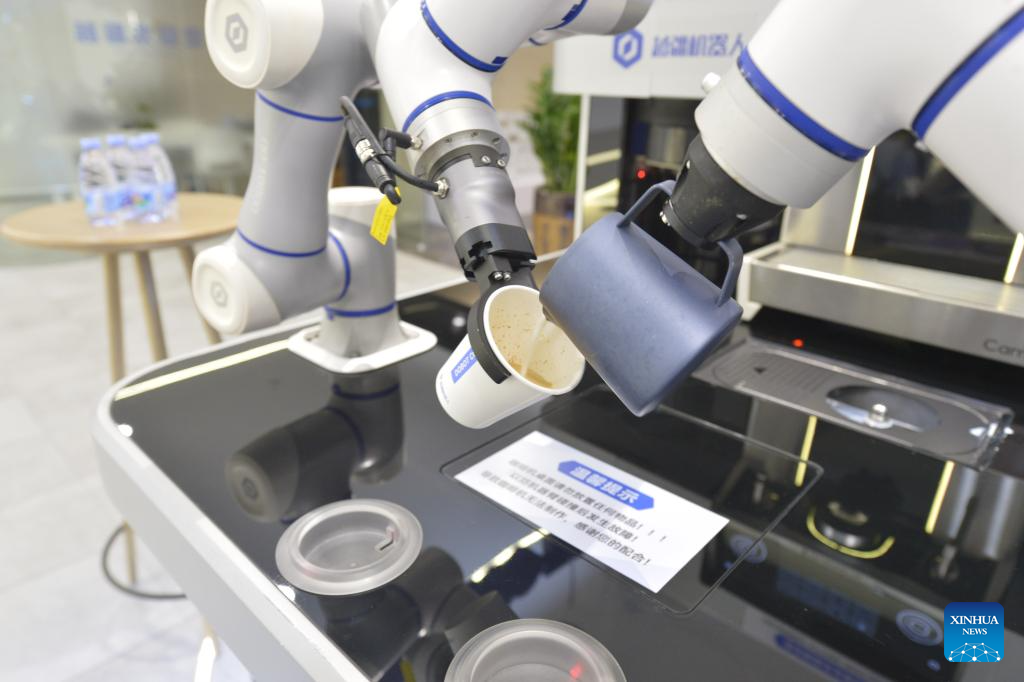 A humanoid robot makes latte art at DOBOT, a collaborative robot company, in Shenzhen, south China's Guangdong Province, Oct. 29, 2025. (Xinhua/Liu Lihang)