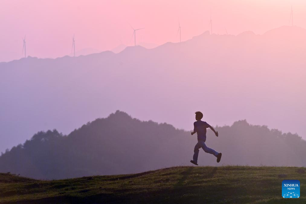 A boy runs during sunset at Yaogao Village's high mountain natural pasture in Rongshui Miao Autonomous County, south China's Guangxi Zhuang Autonomous Region, Aug. 14, 2024. (Xinhua/Huang Xiaobang)
