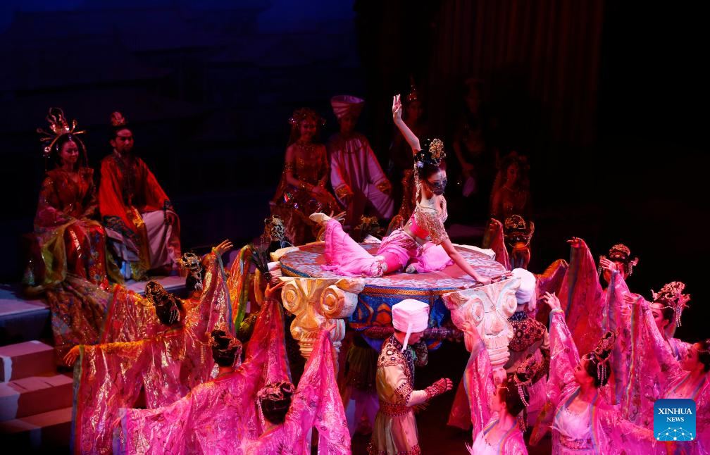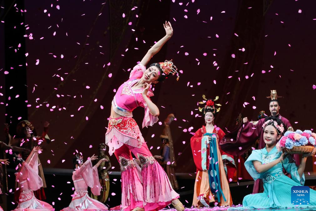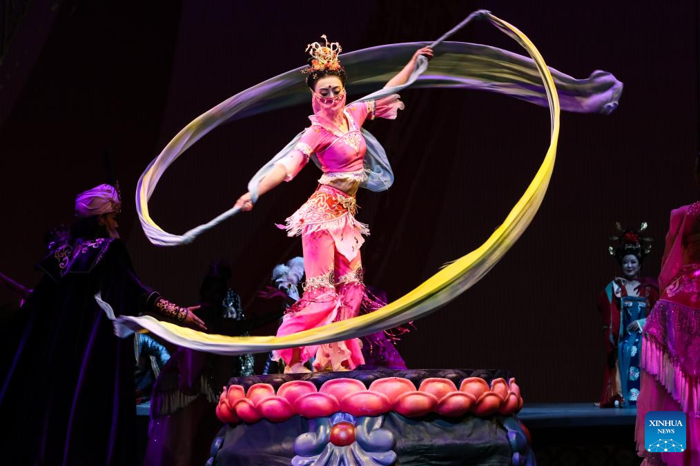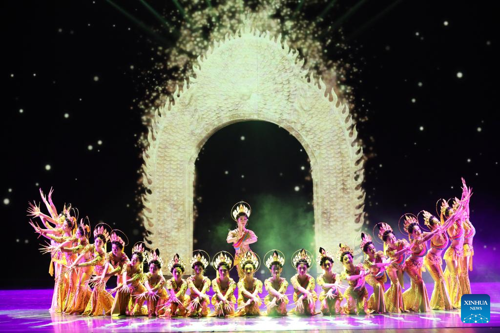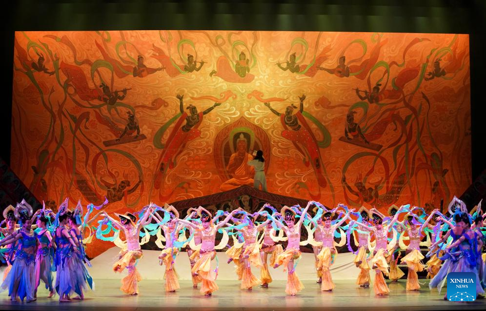 The dance drama "Flower Rains Along Silk Road" is staged at the Dunhuang Theater in Dunhuang, northwest China's Gansu Province, Sept. 20, 2025. (Xinhua/Lang Bingbing)