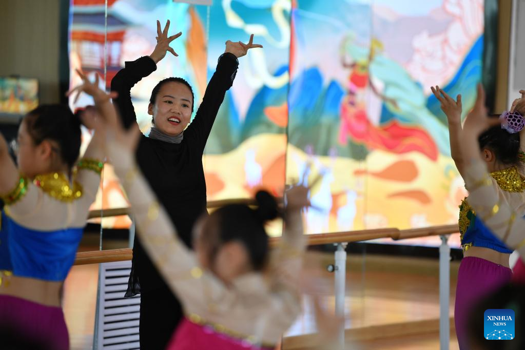 A teacher instructs students Dunhuang dance at a primary school in Dunhuang, northwest China's Gansu Province, April 26, 2023. (Xinhua/Chen Bin)