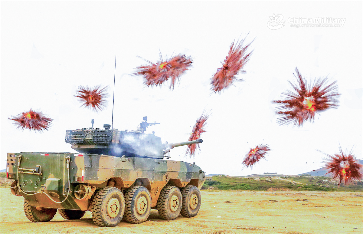 A ZLT11 wheeled armored assault vehicle attached to a brigade under the Chinese PLA 72nd Group Army fires off smoke grenades during a live-fire training exercise on October 27, 2025. (eng.chinamil.com.cn/Photo by Zhang Mao)