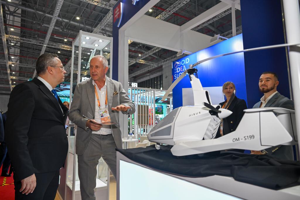 An exhibitor (2nd L) introduces an aircraft product to a visitor (1st L) at the Slovakia Pavilion of the eighth China International Import Expo (CIIE) in east China's Shanghai, Nov. 5, 2025. (Xinhua/Chen Haoming)