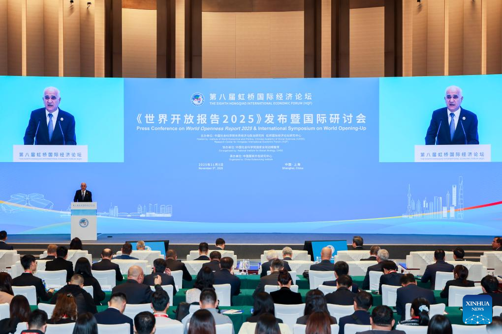 A press conference on World Openness Report 2025 and International Symposium on World Opening-Up is held during the 8th Hongqiao International Economic Forum in Shanghai, east China, Nov. 5, 2025. (Xinhua/Wang Xiang)