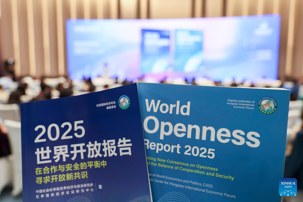 The World Openness Report 2025 is pictured at the press conference on World Openness Report 2025 and International Symposium on World Opening-Up during the 8th Hongqiao International Economic Forum in Shanghai, east China, Nov. 5, 2025. (Xinhua/Wang Xiang)