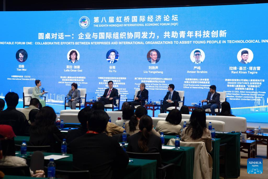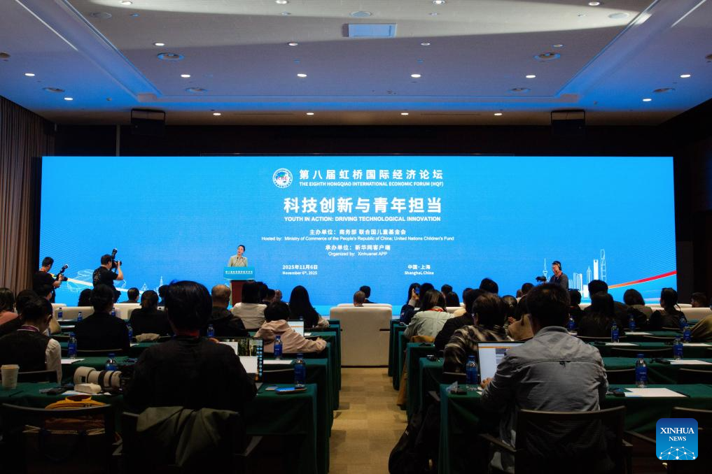 A sub-forum titled "Youth in Action: Driving Technological Innovation" is held during the 8th Hongqiao International Economic Forum at the National Exhibition and Convention Center (Shanghai) in Shanghai, east China, Nov. 6, 2025. (Xinhua/Tian Weiwei)