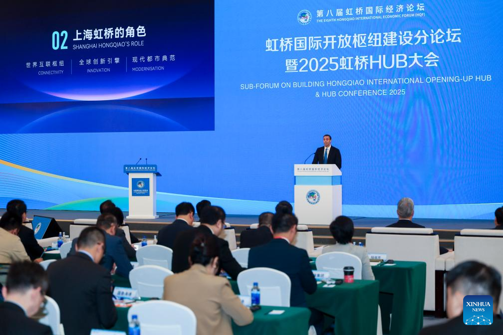 The Sub-forum on Building Hongqiao International Opening-up Hub and Hub Conference 2025 is held during the 8th Hongqiao International Economic Forum at the National Exhibition and Convention Center (Shanghai) in Shanghai, east China, Nov. 6, 2025. (Xinhua/Wang Xiang)