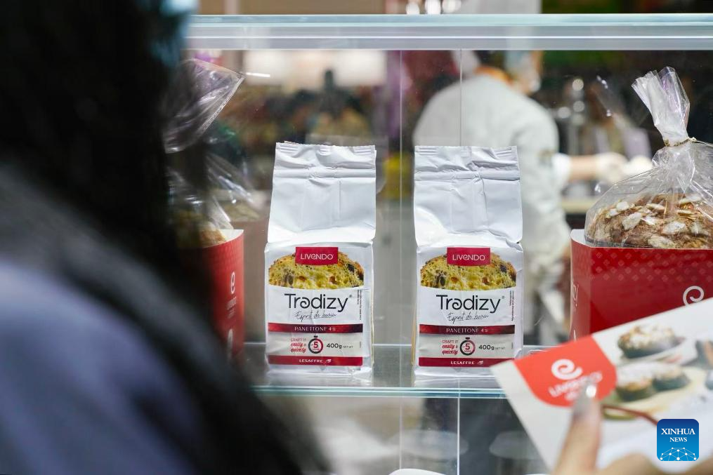 A premix powder product of Lesaffre, which will be launched during the 8th China International Import Expo (CIIE), is pictured at the Food and Agricultural Products exhibition area of the expo in east China's Shanghai, Nov. 6, 2025. Many exhibitors debuted their latest products at the 8th CIIE in Shanghai. (Xinhua/Liu Wenhui)