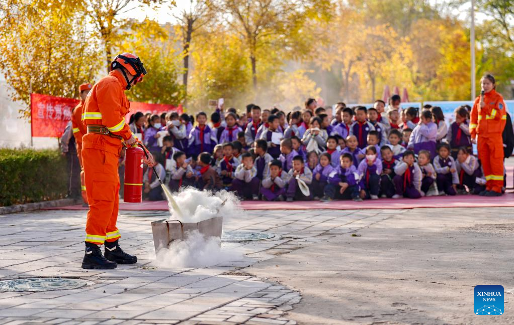 A staff member of Ningxia Helan Mountain National Nature Reserve Administration explains the use of fire extinguisher to students at a primary school in Yinchuan, northwest China's Ningxia Hui Autonomous Region, Nov. 7, 2025. Currently, the risk of forest fire is high across the Helan Mountain. Staff members of local nature reserve administration have rolled out a series of educational activities with the theme of forest fire prevention, aiming to enhance students' safety awareness via lectures, equipment demonstrations, and hands-on experiences. (Xinhua/Yang Zhisen)