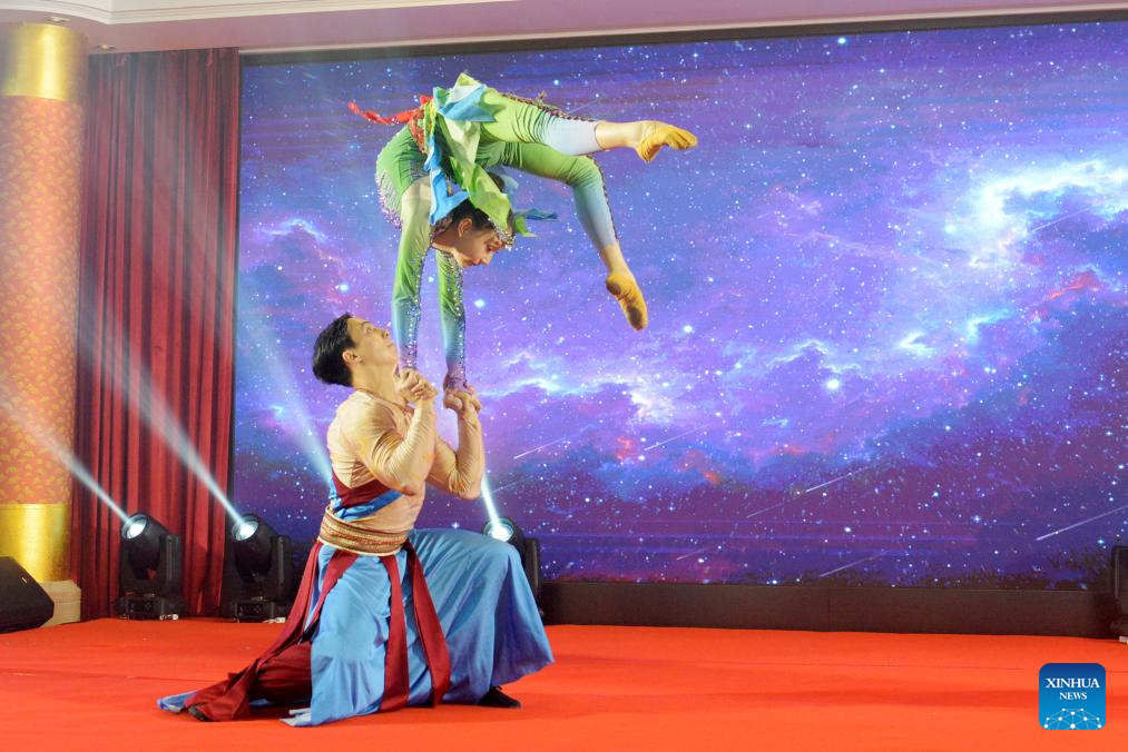 Chinese artists perform during an open day event at the Embassy of China in Cambodia in Phnom Penh, Cambodia on Nov. 8, 2025. The Embassy of China in Cambodia on Saturday hosted an open day event, welcoming hundreds of Cambodian youths. The event featured a variety of activities such as Chinese cultural performances, cuisine, and calligraphy, among others. (Photo by Phearum/Xinhua)