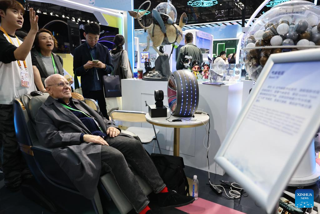 A guest tries Scent TV at the China Pavilion during the eighth China International Import Expo (CIIE) in east China's Shanghai, Nov. 8, 2025. Over 30 foreign talents and their families were invited to visit the eighth CIIE at the National Convention and Exhibition Center (Shanghai) during a themed event on Saturday. (Xinhua/Fang Zhe)