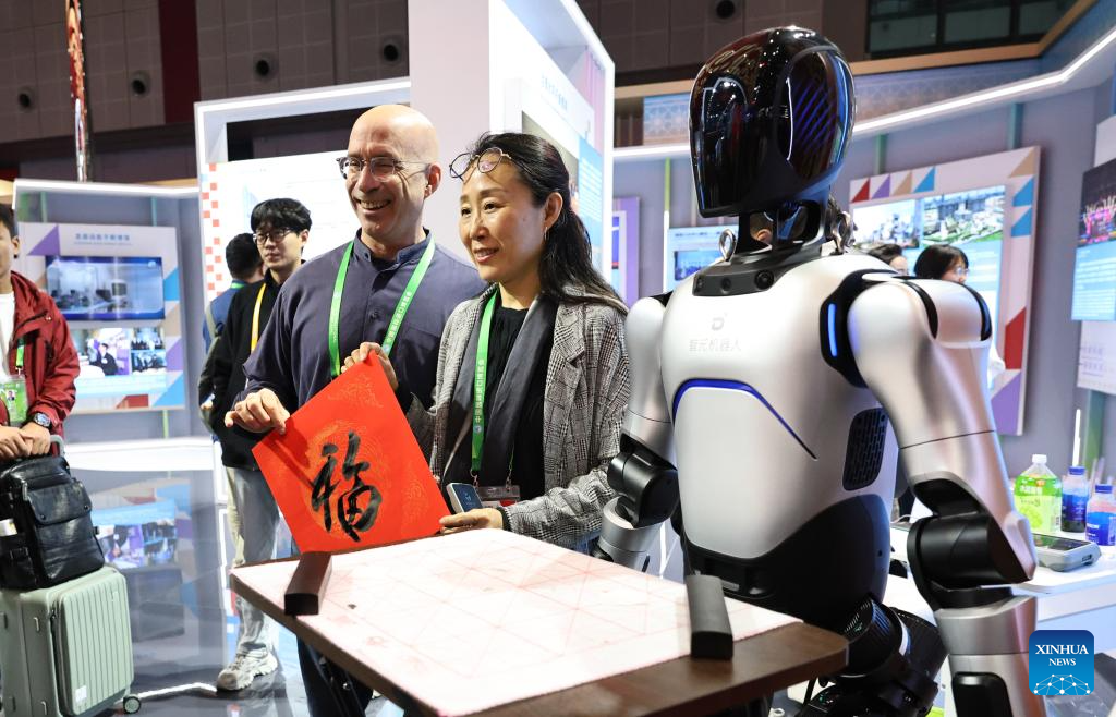Guests hold a calligraphy written by a humanoid robot at the China Pavilion during the eighth China International Import Expo (CIIE) in east China's Shanghai, Nov. 8, 2025. Over 30 foreign talents and their families were invited to visit the eighth CIIE at the National Convention and Exhibition Center (Shanghai) during a themed event on Saturday. (Xinhua/Fang Zhe)