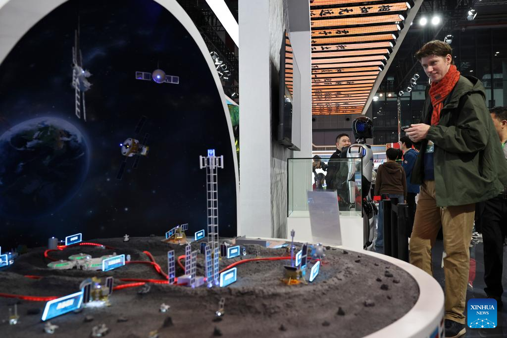 A guest views a model displaying China's lunar exploration program at the China Pavilion during the eighth China International Import Expo (CIIE) in east China's Shanghai, Nov. 8, 2025. Over 30 foreign talents and their families were invited to visit the eighth CIIE at the National Convention and Exhibition Center (Shanghai) during a themed event on Saturday. (Xinhua/Fang Zhe)