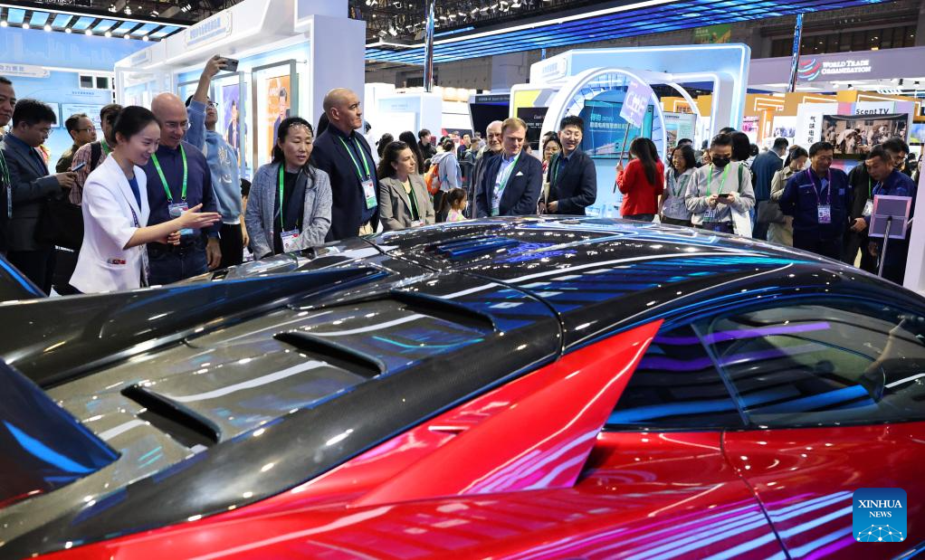 Guests view a new energy vehicle (NEV) of BYD, China's leading NEV manufacturer, at the China Pavilion during the eighth China International Import Expo (CIIE) in east China's Shanghai, Nov. 8, 2025. Over 30 foreign talents and their families were invited to visit the eighth CIIE at the National Convention and Exhibition Center (Shanghai) during a themed event on Saturday. (Xinhua/Fang Zhe)