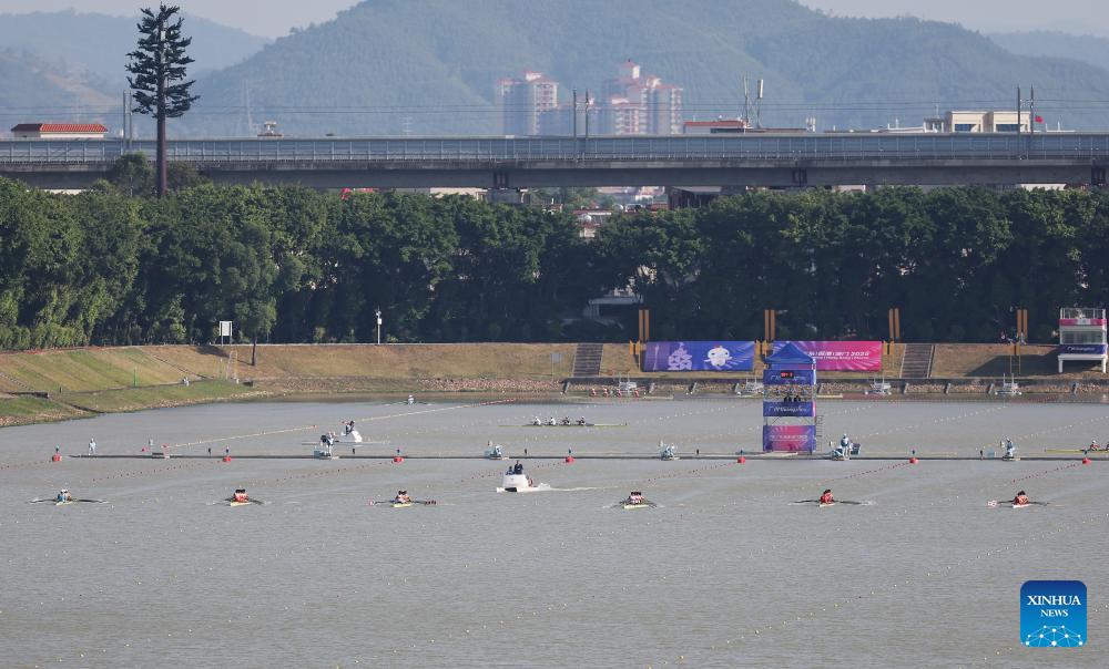 Teams compete during the men's quadruple sculls final of rowing at China's 15th National Games in Guangzhou, south China's Guangdong Province, Nov. 10, 2025. (Xinhua/Pan Yulong)