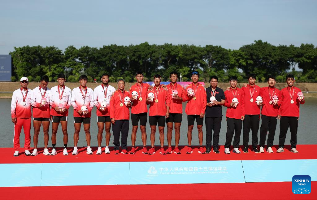 Gold medalists team Jiangsu (C), silver medalists team Guangdong (L), bronze medalists team of Inpidual Athletes pose during the awarding ceremony for the men's quadruple sculls final of rowing at China's 15th National Games in Guangzhou, south China's Guangdong Province, Nov. 10, 2025. (Xinhua/Pan Yulong)