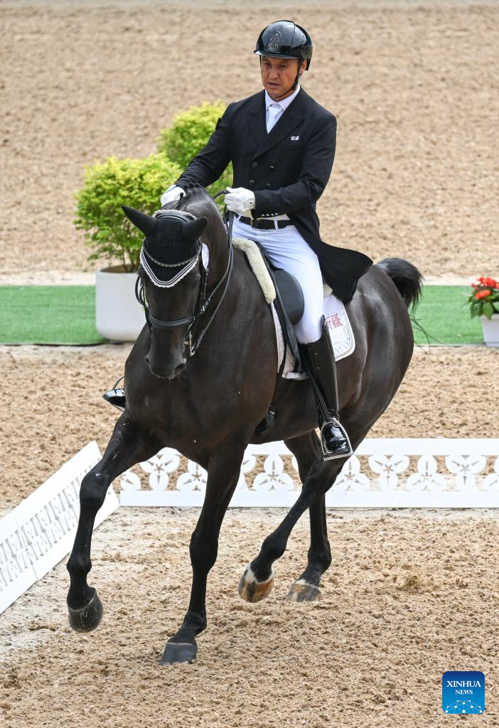 Liu Zhong of Xinjiang competes during the equestrian dressage team final at China's 15th National Games in Shenzhen, south China's Guangdong Province, Nov. 10, 2025. (Xinhua/Lian Zhen)