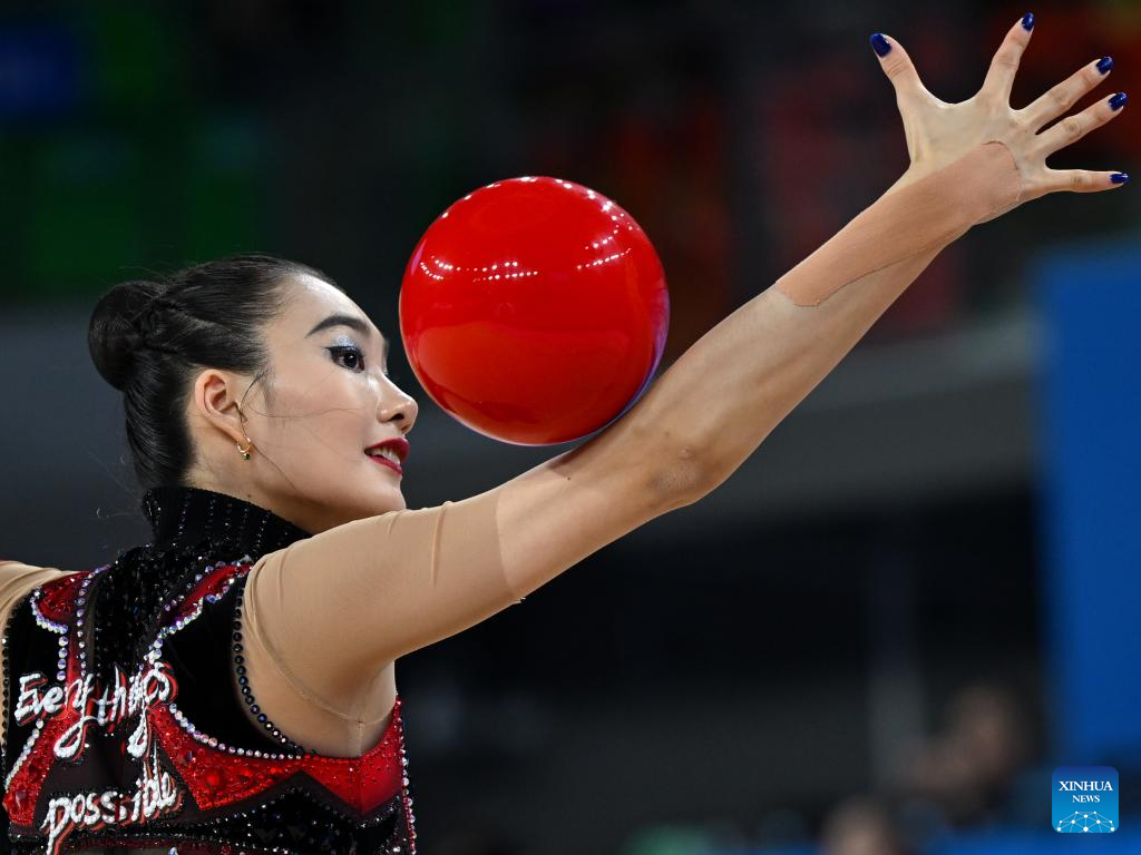 Wang Zilu of Shaanxi performs during the ball event of the individual all-around final of rhythmic gymnastics at China's 15th National Games in Shenzhen, south China's Guangdong Province, Nov. 10, 2025. (Xinhua/Hao Yuan)
