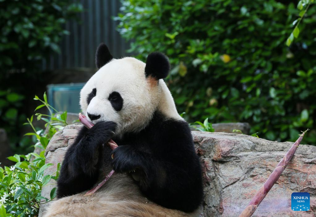 Giant panda Yilan eats bamboos at Adelaide Zoo in Adelaide, Australia, Nov. 10, 2025. The giant panda pair Xingqiu, a male, and Yilan, a female, arrived in Adelaide on Dec. 15, 2024. According to the contract, they will spend ten years at Adelaide Zoo, replacing the pair Wangwang and Funi who returned to China last November after 15 years in Australia. (Xinhua/Ma Ping)