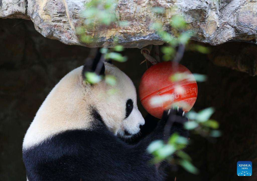 Giant panda Yilan plays with a toy at Adelaide Zoo in Adelaide, Australia, Nov. 10, 2025. The giant panda pair Xingqiu, a male, and Yilan, a female, arrived in Adelaide on Dec. 15, 2024. According to the contract, they will spend ten years at Adelaide Zoo, replacing the pair Wangwang and Funi who returned to China last November after 15 years in Australia. (Xinhua/Ma Ping)