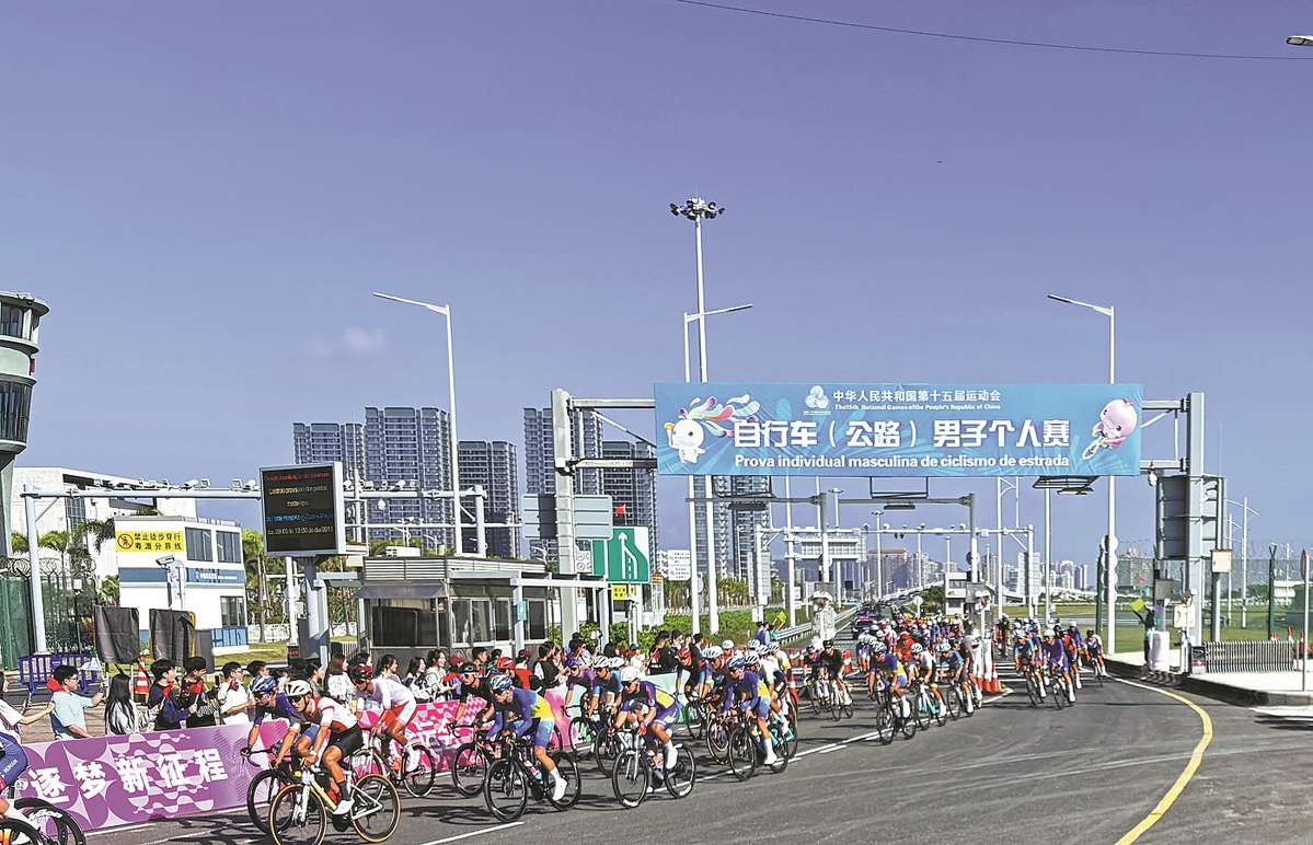 Crowds of people eagerly lined the railings on both sides of the scenic Qinglyu Road in Zhuhai, Guangdong province, on Saturday, as a sea breeze took the edge off the hot day. The spectators were waiting for over 100 competitors in the men's individual road cycling race at the ongoing 15th National Games.