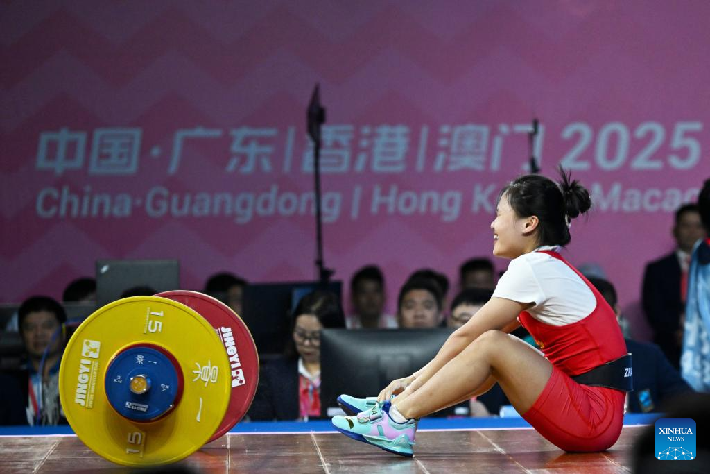 Zhao Jinhong of Guangxi competes in snatch during the weightlifting women's 45kg final at China's 15th National Games in Dongguan, south China's Guangdong Province, Nov. 10, 2025. (Xinhua/Yang Chenguang)