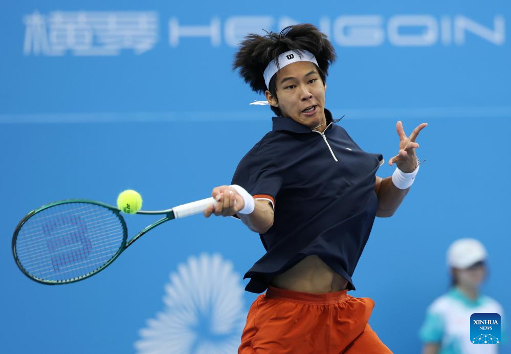 Shang Juncheng of Beijing competes against Zhou Yi of Guangxi during the junior men's team semifinal match between Beijing and Guangxi at China's 15th National Games in Hengqin, south China's Guangdong Province, Nov. 11, 2025. (Xinhua/Zhang Chenlin)
