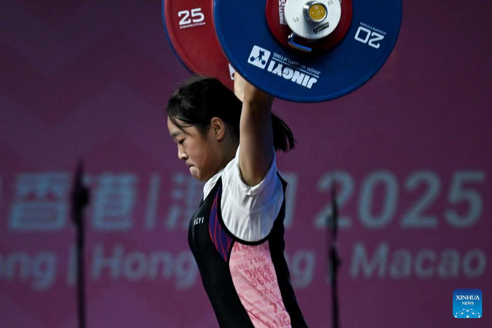 Wei Tingna of Fujian competes in snatch during the weightlifting women's 55kg final at China's 15th National Games in Dongguan, south China's Guangdong Province, Nov. 11, 2025. (Xinhua/Yang Chenguang)