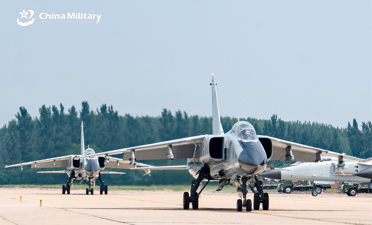Two JH-7A fighter bombers attached to an aviation brigade of the Chinese PLA Air Force taxi on the runway during an air-to-surface operation training exercise on November 4, 2025. (eng.chinamil.com.cn/Photo by Zhang Yue)