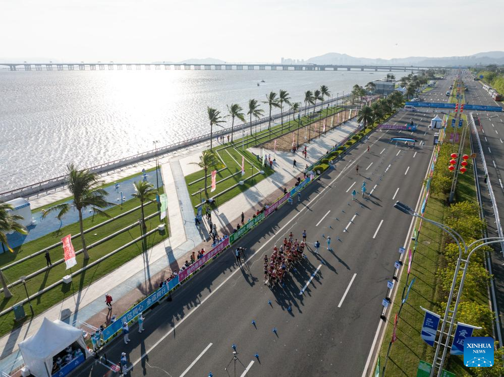 An aerial drone photo taken on Nov. 12, 2025 shows athletes competing during the men's 20km race walk of athletics at China's 15th National Games in Zhuhai, south China's Guangdong Province. (Xinhua/Mao Siqian)