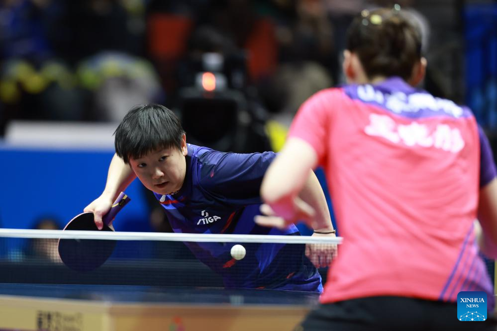 Zhu Yuling (top) hits a return during the table tennis women's singles quarterfinal match between Zhu Yuling of Macao and Chen Xingtong of Liaoning at China's 15th National Games in Macao, south China, Nov. 13, 2025. (Xinhua/Liu Xu)