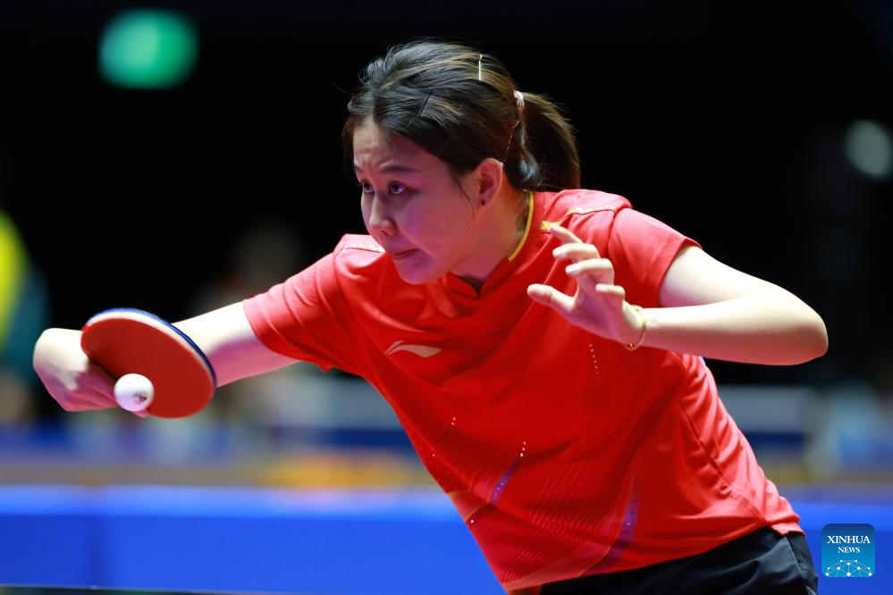 He Zhuojia hits a return during the table tennis women's singles round of 16 match between Chen Meng of Shandong and He Zhuojia of Hebei at China's 15th National Games in Macao, south China, Nov. 12, 2025. (Xinhua/Liu Xu)