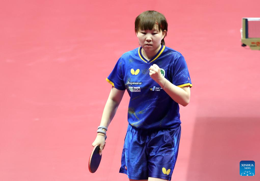 Zhu Yuling celebrates scoring during the table tennis women's singles quarterfinal match between Zhu Yuling of Macao and Chen Xingtong of Liaoning at China's 15th National Games in Macao, south China, Nov. 13, 2025. (Xinhua/Liang Xu)