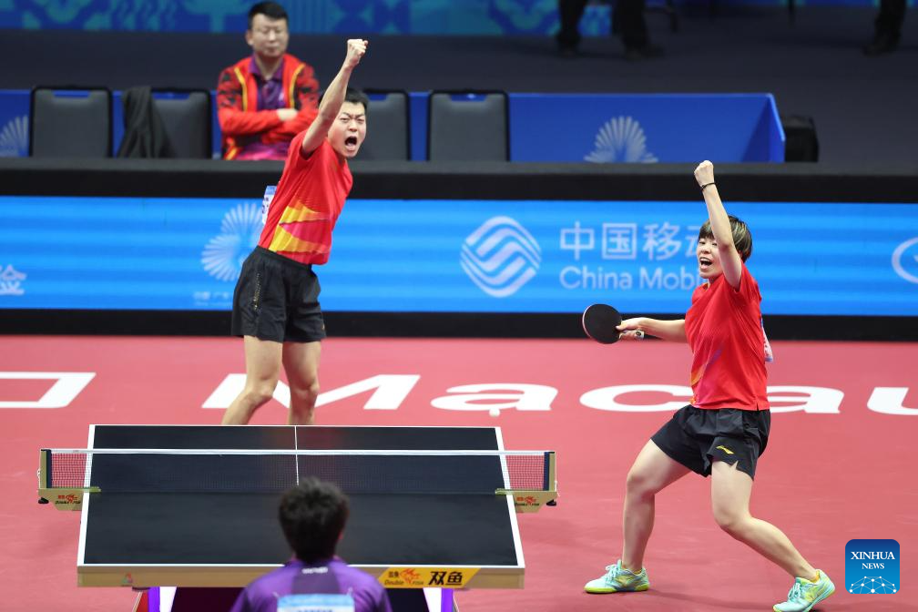 Lin Gaoyuan/Liu Shiwen (L) celebrate after winning the table tennis mixed doubles semifinal match between Lin Gaoyuan/Liu Shiwen of Guangdong and Yuan Licen/Wang Yidi of Liaoning at China's 15th National Games in Macao, south China, Nov. 13, 2025. (Xinhua/Liu Xu)