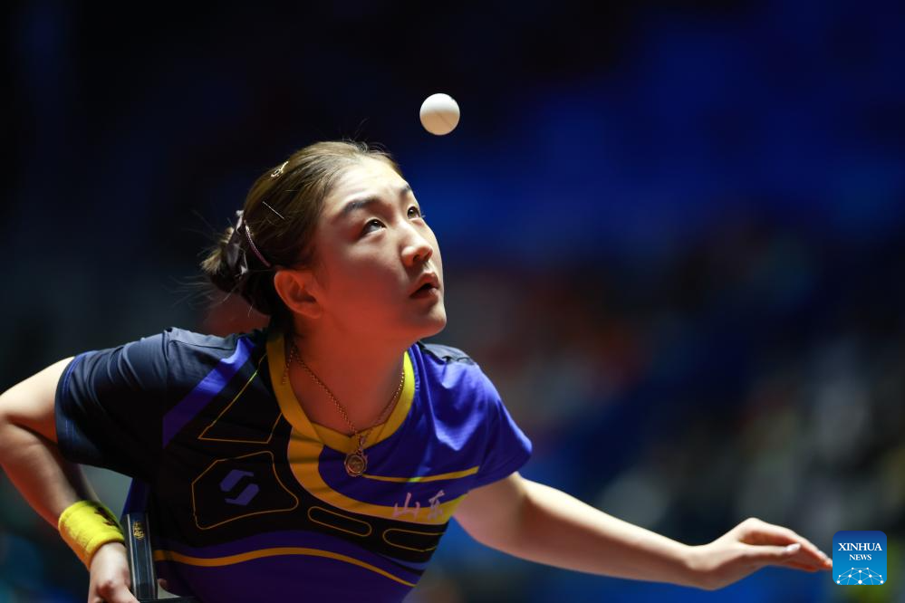 Sun Yingsha competes during the table tennis women's singles round of 16 match between Sun Yingsha of Hebei and Wang Xiaotong of Shandong at China's 15th National Games in Macao, south China, Nov. 12, 2025. (Xinhua/Liu Xu)