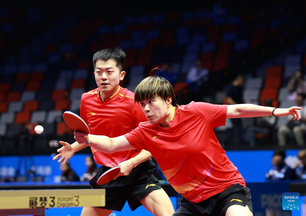 Yuan Licen/Wang Yidi (R) compete during the table tennis mixed doubles semifinal match between Lin Gaoyuan/Liu Shiwen of Guangdong and Yuan Licen/Wang Yidi of Liaoning at China's 15th National Games in Macao, south China, Nov. 13, 2025. (Xinhua/Chen Bin)