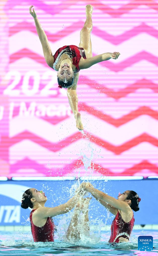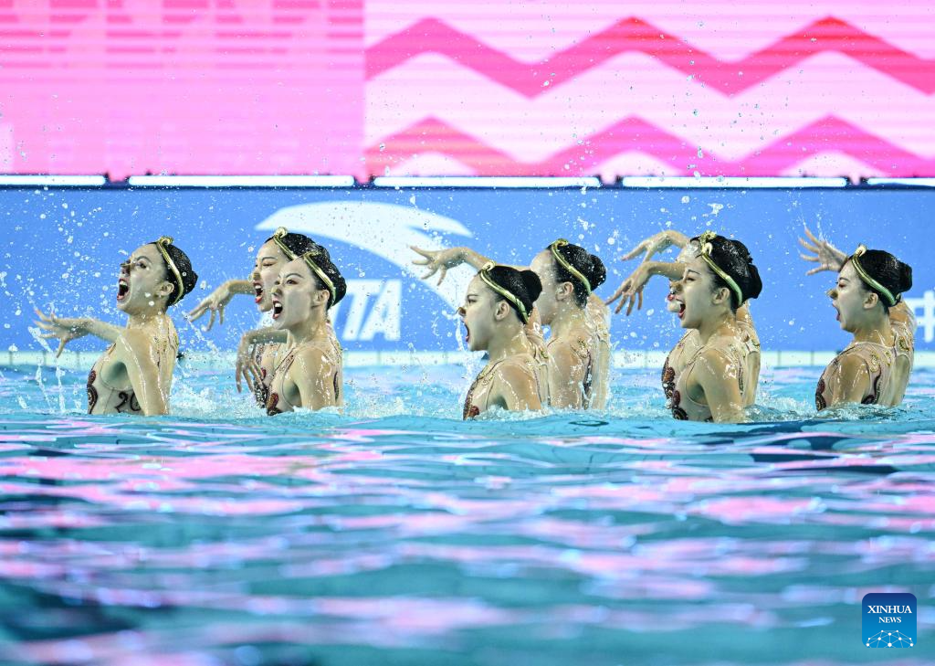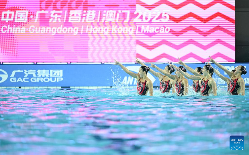 Team Beijing Sport University perform during the team technical of artistic swimming at China's 15th National Games in Jiangmen, south China's Guangdong Province, Nov. 13, 2025. (Xinhua/Chen Zhonghao)