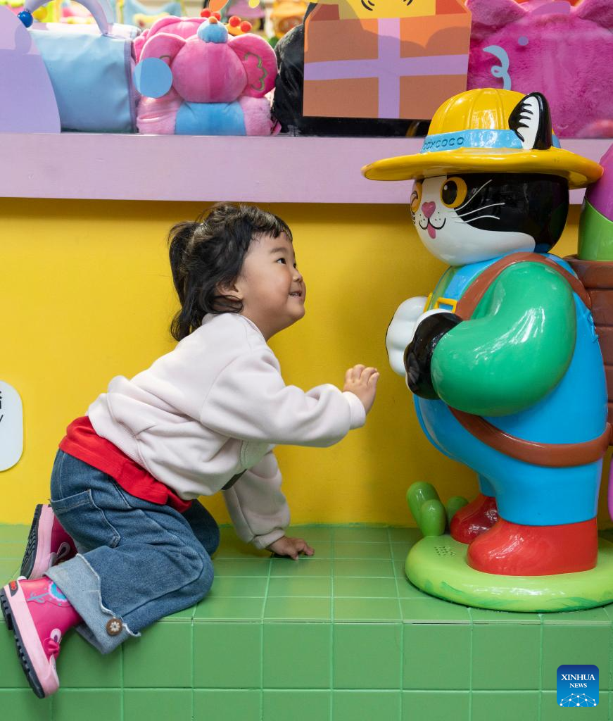 A child looks at a kitten statue at the door of a shop at the Yuyuan Road Historical and Cultural Block in east China's Shanghai, Nov. 12, 2025. (Xinhua/Cai Yang)