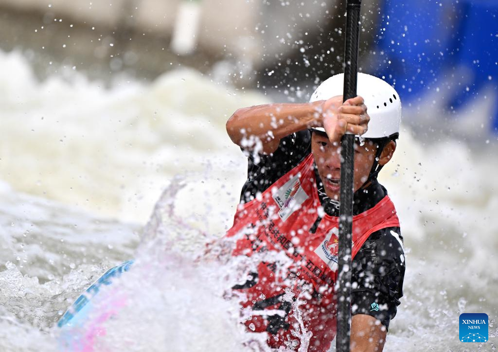 Quan Xin of Fujian competes during the men's kayak single final of canoe slalom at China's 15th National Games in Guangzhou, south China's Guangdong Province, Nov. 13, 2025. (Xinhua/Tang Yi)