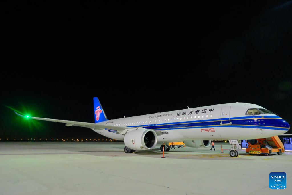 This photo taken on Nov. 14, 2025 shows a China Southern Airlines C919 aircraft at Al Maktoum International Airport in Dubai, the United Arab Emirates (UAE). (China Southern Airlines/Handout via Xinhua)