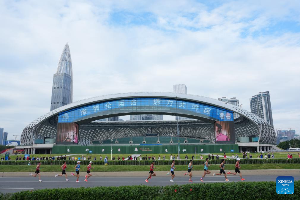 Athletes compete during the men's marathon event at China's 15th National Games in Shenzhen, south China's Guangdong Province, Nov. 15, 2025. (Xinhua/Lian Zhen)