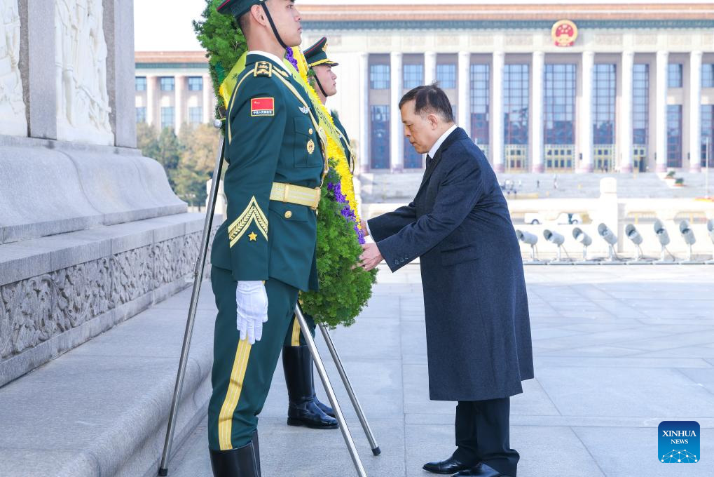 King Maha Vajiralongkorn Phra Vajiraklaochaoyuhua of the Kingdom of Thailand lays a wreath at the Monument to the People's Heroes on Tian'anmen Square in Beijing, capital of China, Nov. 15, 2025. (Xinhua/Liu Bin)