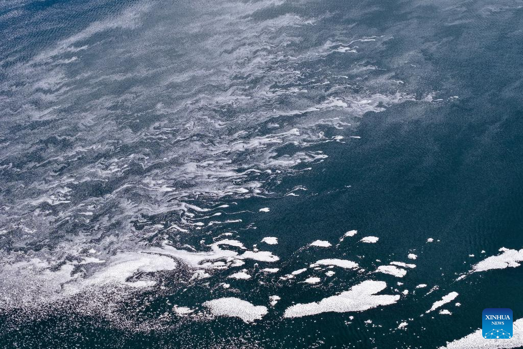 An aerial drone photo taken on Nov. 16, 2025 shows the frozen surface of the Dasugan Lake in Kazak Autonomous County of Aksay, Jiuquan, northwest China's Gansu Province. Dasugan Lake and Xiaosugan Lake are connected and are both formed by the meltwater from the Qilian Mountains. A unique phenomenon is that the upstream Xiaosugan Lake is a freshwater lake, while the downstream Dasugan Lake is a saline lake. (Xinhua/Lang Bingbing)