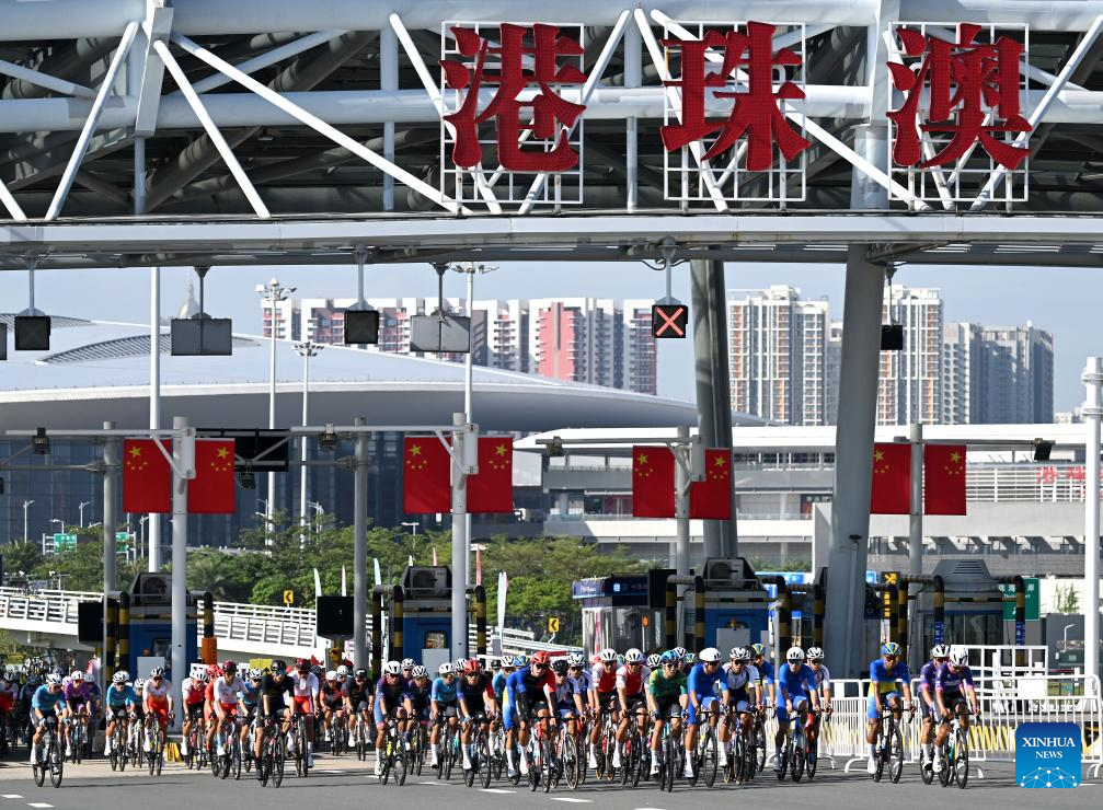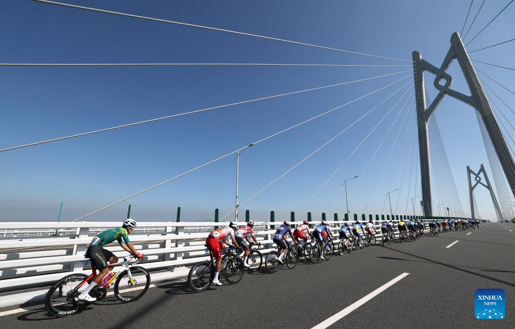 Cyclists compete across the Hong Kong-Zhuhai-Macao Bridge during the men's road race of cycling road at China's 15th National Games in south China's Guangdong Province, Nov. 8, 2025. (Xinhua/Mao Siqian)