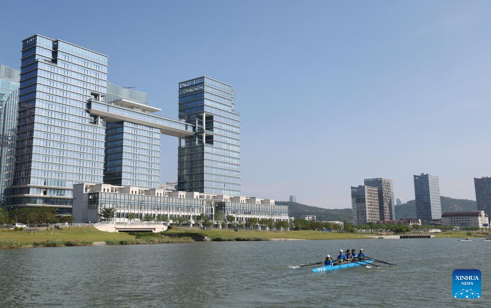 Trainees from Macao University of Science and Technology exercise rowing on the Tianmu River in Hengqin, south China's Guangdong Province, Nov. 1, 2025. (Xinhua/Xiao Ennan)