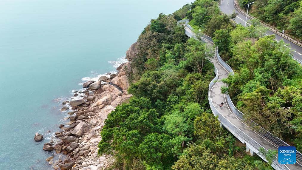 An aerial drone photo taken on Oct. 29, 2025 shows Wong Wan Yiu riding by the sea in Shenzhen, south China's Guangdong Province. (Xinhua/Liang Xu)